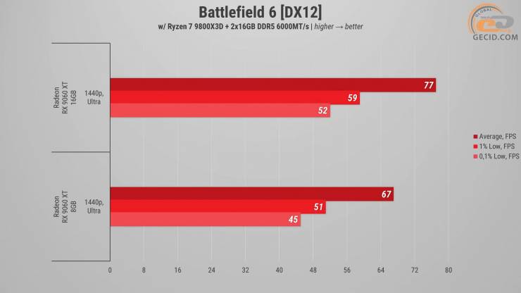 Взрывы, плотные эффекты частиц и масштабные разрушения в Battlefield 6 отражают реальную нагрузку на систему. Версия RX 9060 XT с 16 ГБ выдает в среднем 77 FPS, обеспечивая плавный геймплей даже в моменты максимального напряжения. Младшая же модификация прогнозируемо немного отстает и закрепляется на результате в 67 FPS. Хотя частота кадров остается и в комфортном диапазоне, в тяжелых сценах чувствуется немного меньшая стабильность и заметные колебания. Это связано с активным использованием видеобуфера и более частыми подгрузками текстур. Но в итоге обе карты справляются с Ultra-прессетом на удовлетворительную оценку.