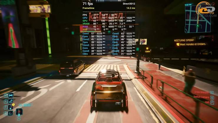 После последних обновлений Cyberpunk 2077 заметно сложнее дается видеокартам Radeon, особенно в режимах с тяжелой трассировкой лучей. Поэтому на пресете RT Ultra, разве что при помощи производительного FSR 16-гигабайтная RX 9060 XT выдает 68 FPS, и, несмотря на значительную нагрузку, сцены воспроизводятся относительно плавно.