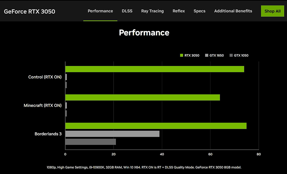 Все потому, что графический процессор RTX 3050 содержит 2560 CUDA-ядер, по 80 тензорных ядер и текстурных модулей, 32 блока растеризации и всего 20 RT-ядер, чего может быть недостаточно при тяжелых настройках трассировки лучей. Также большим минусом становится маленький L2 кэш объемом всего в 2 МБ. Базовые частоты работы ускорителя составляют 1552 МГц и 1822 в бустовом режиме. Что касается VRAM, то здесь предусмотрено 8 ГБ GDDR6, которые образуют 224 ГБ/c пропускной способности по 128-битной шине. А как преимущество можно отметить достаточно скромный уровень TDP всего в 130 Вт.