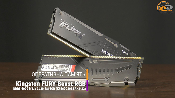 В качестве ОЗУ использовался яркий комплект DDR5-6000 из двух 16-гигабайтных модулей Kingston FURY Beast DDR5 RGB, которые мы разогнали до 6400 МТ/с с таймингами 32-39-39 после увеличения питающего напряжения до 1,4 В.