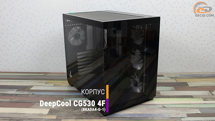 Все компоненты установлены вместе в современный ATX-корпус DeepCool CG530 4F с панорамными стеклянными панелями и двухкамерным расположением, что обеспечивает аккуратную компоновку и эффектный вид. В комплекте идут четыре ARGB-вентилятора, благодаря чему из коробки мы получаем качественную циркуляцию воздуха.