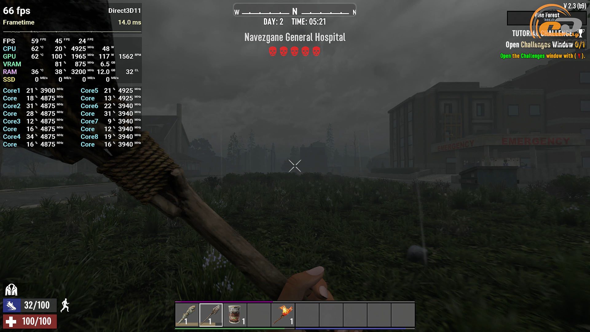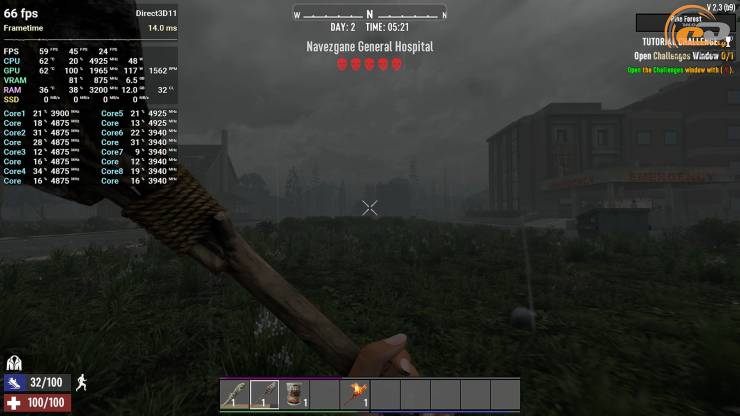Начинаем с позитива, ведь 7 Days to Die достаточно бодро запускается даже на ультра настройках и играется абсолютно комфортно. Иногда, пробегая через густую растительность, можно увидеть небольшие просадки уровня FPS. Также стоит отметить наличие периодических подергиваний, присущих этой игре с ультра графикой почти на всех системах с разными показателями производительности. Однако критического влияния на геймплей из-за этого не прослеживается.