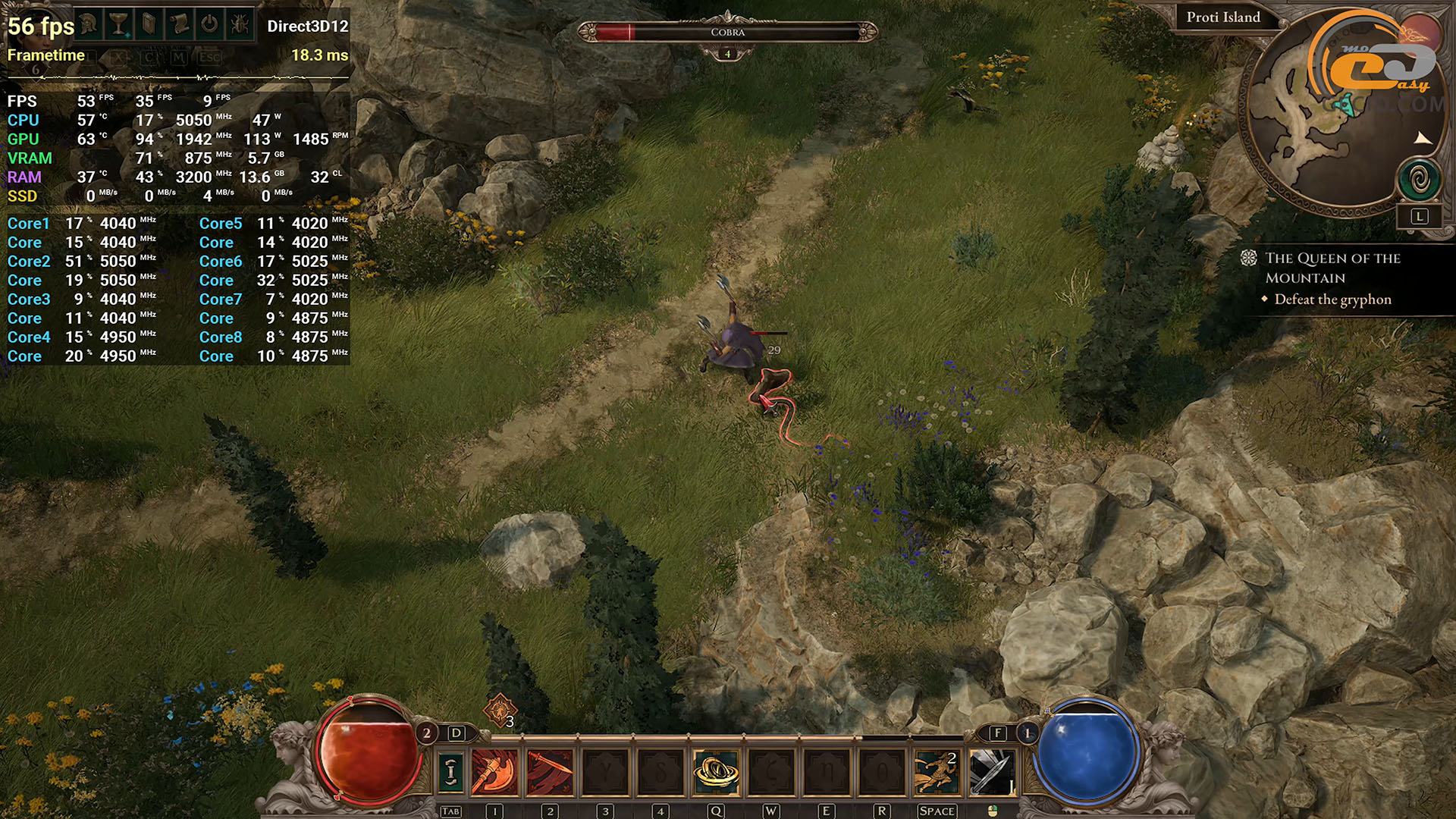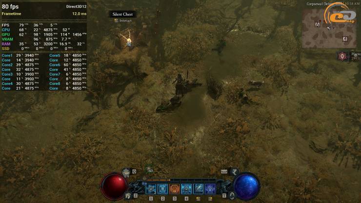 Неожиданно в Diablo IV видеокарте оказался подсилу и максимально доступный пресет графики без трассировки лучей. Плюс, невзирая на практически стопроцентно забитый видеобуфер, получается активировать DLSS в режиме дополнительного сглаживания. На деле имеем от 70 до 80 средних кадров в секунду, но здесь есть довольно неприятный нюанс, о котором свидетельствует статистика очень редких событий — довольно рандомные подергивания, которые впоследствии могут немного повлиять на общие впечатления от игры.