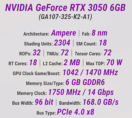 Также вспомним, что позже компания NVIDIA выпустила вариант RTX 3050 с еще меньшим объемом видеопамяти – всего 6 ГБ с очень узкой 96-битной шиной. Она получила более низкие рабочие частоты только в 1042 МГц и 1470 в состоянии буста. В графический чип было заложено 2304 CUDA-ядра, 72 тензорных ядра и столько же текстурных модулей. Даже количество ядер RT сократили до 18 единиц. Идентичной к более мощной версии оказалось только количество «ропов». Однако из-за совершенно скромных характеристик уровень TDP упал до показателя в 70 Вт.