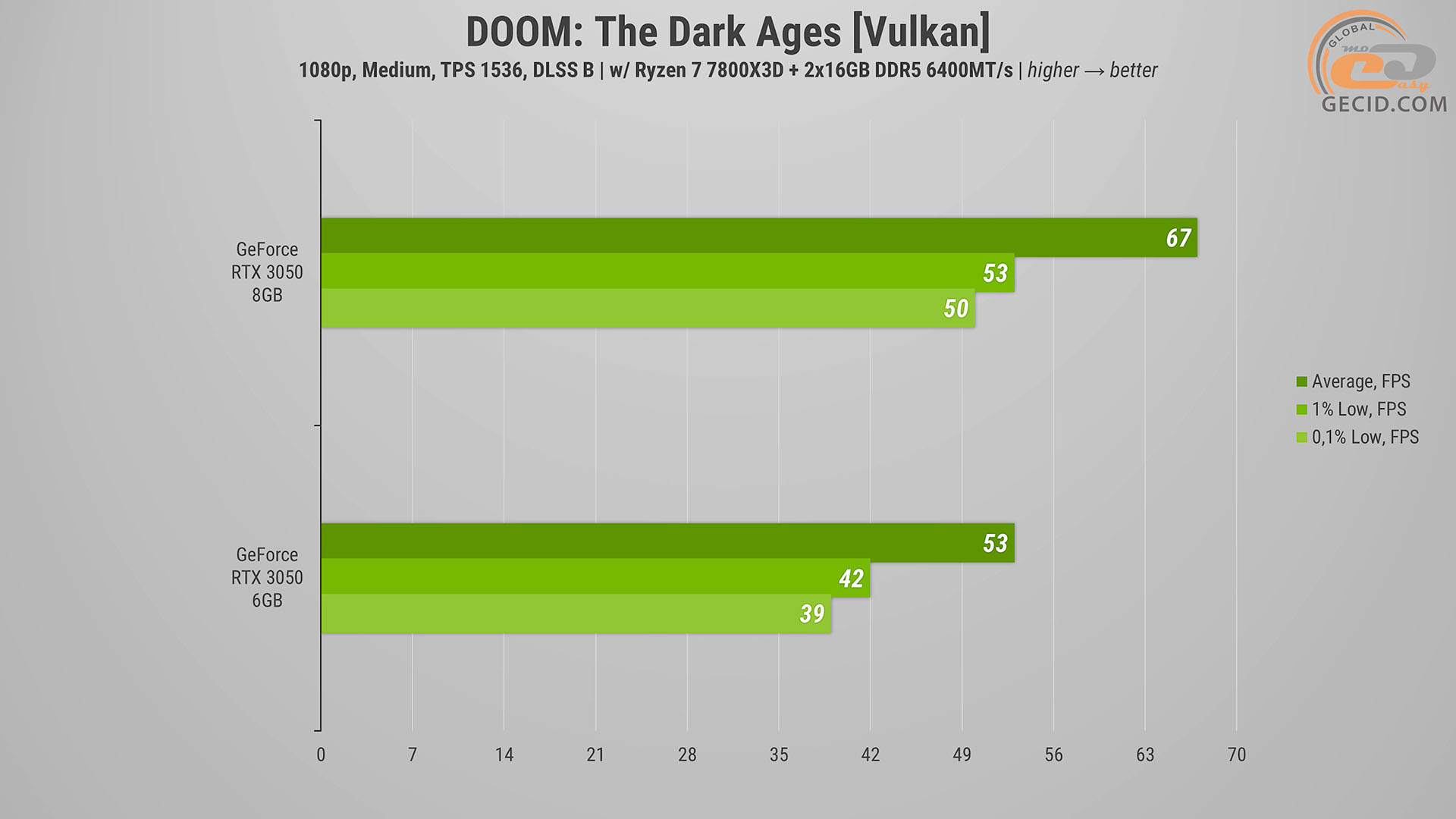 На средних настройках вместе со сбалансированным режимом DLSS в DOOM: The Dark Ages на 8-гигабайтной версии удалось получить более 65 средних кадров в секунду. А вот более слабая версия в свою очередь показала не очень приятный результат FPS, хотя геймплей еще и оставался условно приемлемым.
