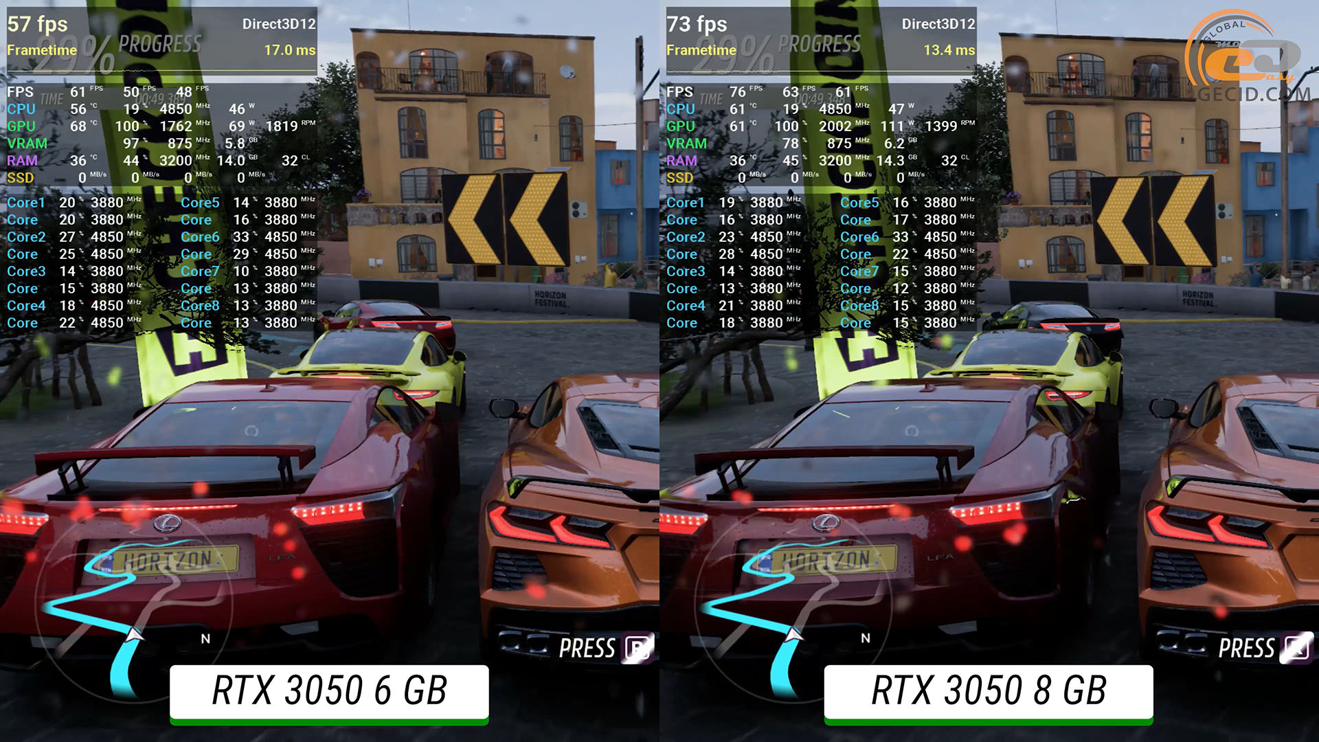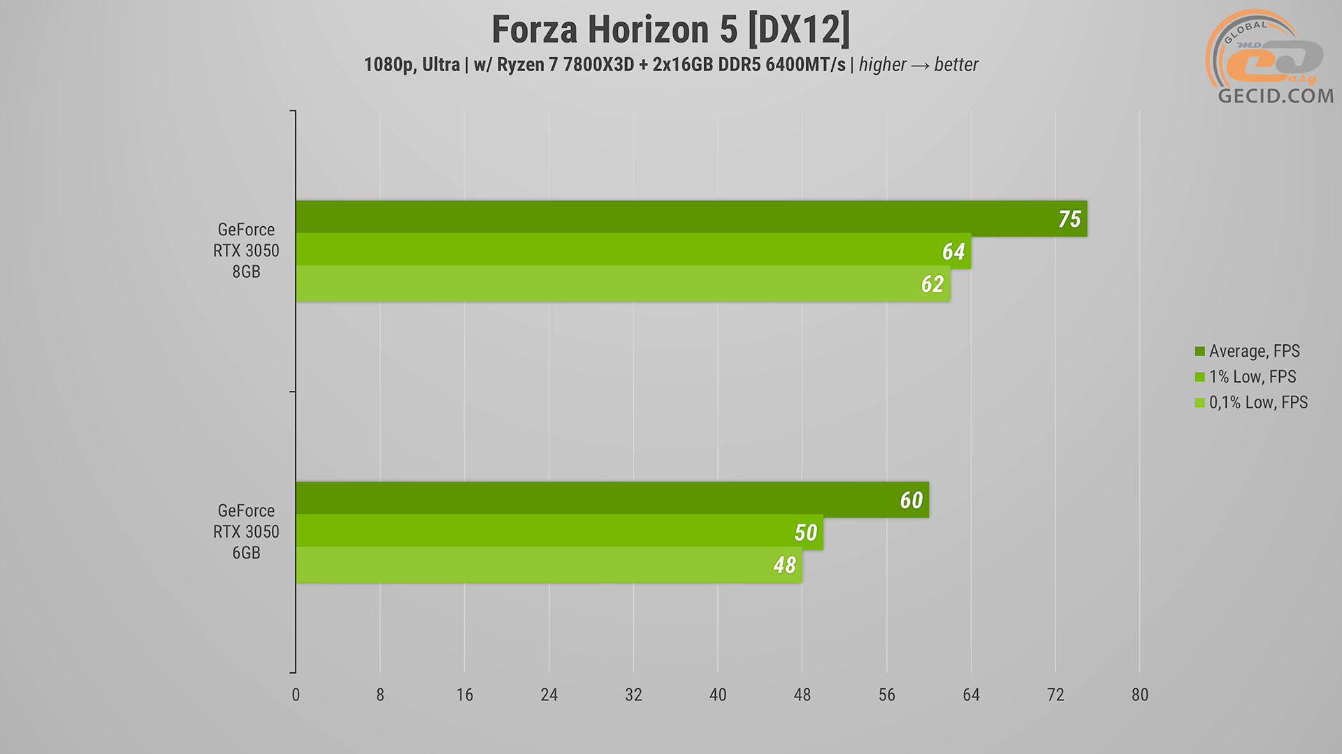 Во время гонки в Forza Horizon 5 на ультрах более мощной версия вновь оказалась больше, чем на 25 процентов сильнее с результатом в 75 средних кадров в секунду, а 6-гигабайтная версия позволила экрану обновляться ровно 60 раз в секунду вместе с предупреждениями о возможной нехватке видеобуфера.