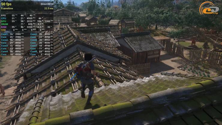 В более тяжелом по нагрузке проекте Assasin's Creed Shadow «ультра» картинка уже остается хорошей мечтой, потому что даже на средних настройках получить приемлемый геймплей получается только после активации качественного режима DLSS. Однако даже так частота обновления экрана остается достаточно изменчивой — поэтому в простых сценах около 70 FPS, а при преодолении тяжелой локации эти значения могут падать до 45-50 обновлений экрана в секунду.