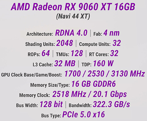 Теперь подробнее рассмотрим характеристики. Официально эта видеокарта позиционируется как устройство для игры в разрешении Quad HD. Поэтому Radeon RX 9060 XT в полноценной версии содержит 16 ГБ памяти типа GDDR6 со скоростью 20 ГБ в секунду на контакт, обеспечивающий 322 ГБ/c пропускной способности, однако по достаточно узкой 128-битной шине.