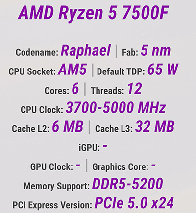 На сегодняшний день самым популярным решением для большинства задач является Socket AM5. Потому в недорогую систему мы установили процессор AMD Ryzen 5 7500F.