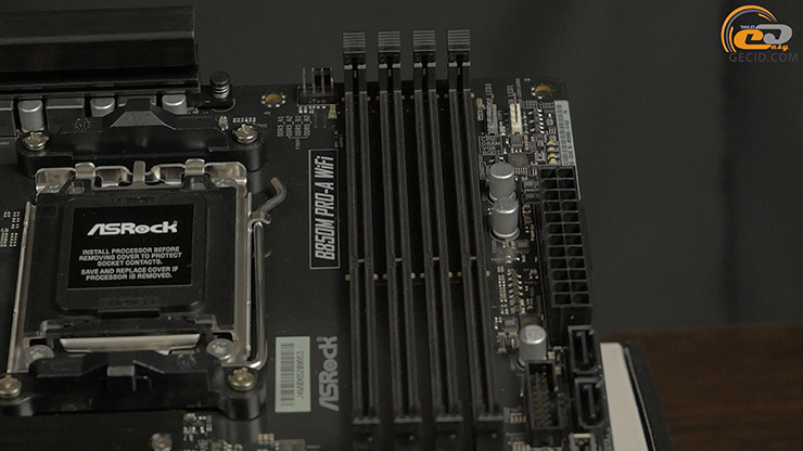 Для памяти предусмотрено четыре слота DDR5 с поддержкой двухканального режима и разгона, а для накопителей три слота M.2, один из которых поддерживает стандарт PCIe 5.0, и 4 порта SATA 3.