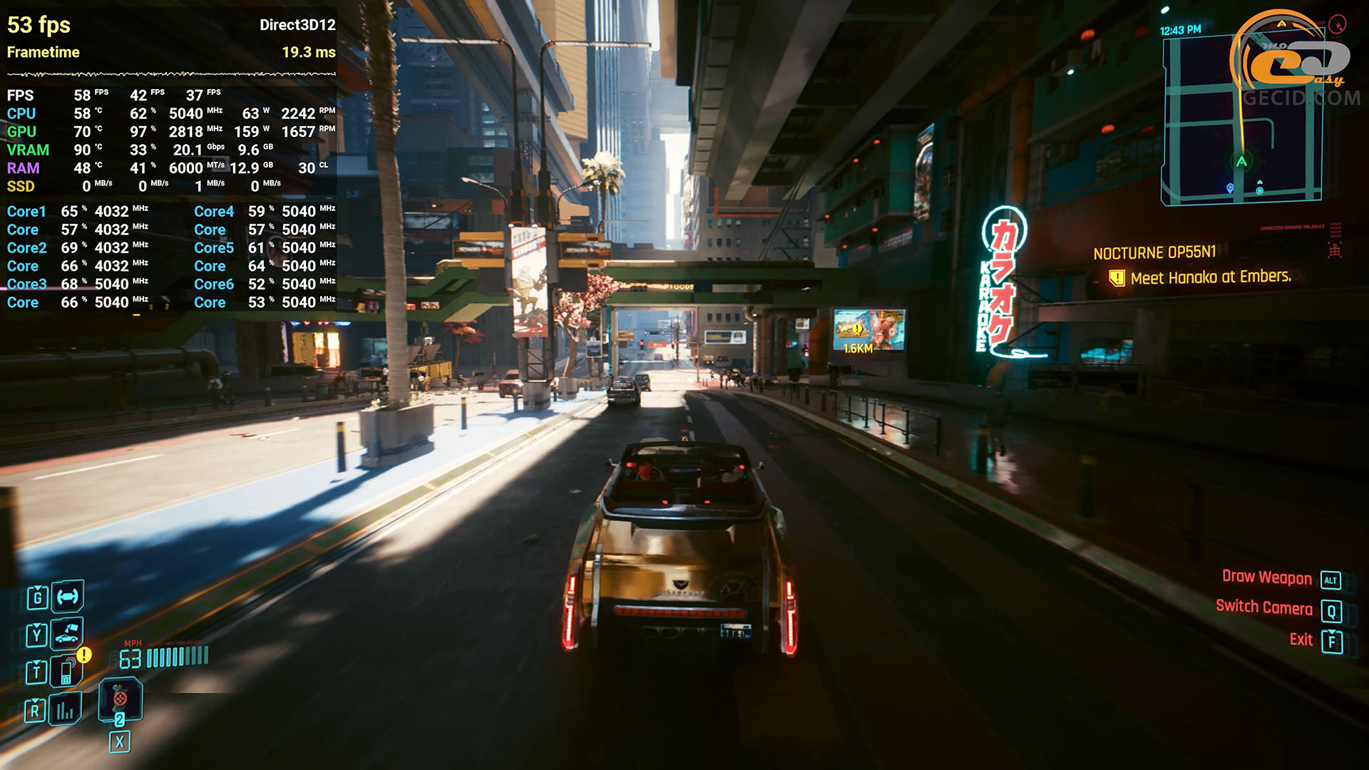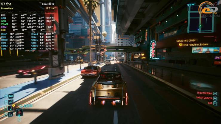 А вот когда полностью выключаем рейтрейсинг, переходя на просто ультранастройку, имеем возможность полностью отключить любые режимы интеллектуального масштабирования. Теперь неоновый город, хоть и не выглядит так ярко, однако частота кадров находится в более высоких значениях, а четкость изображения заметно улучшилась.