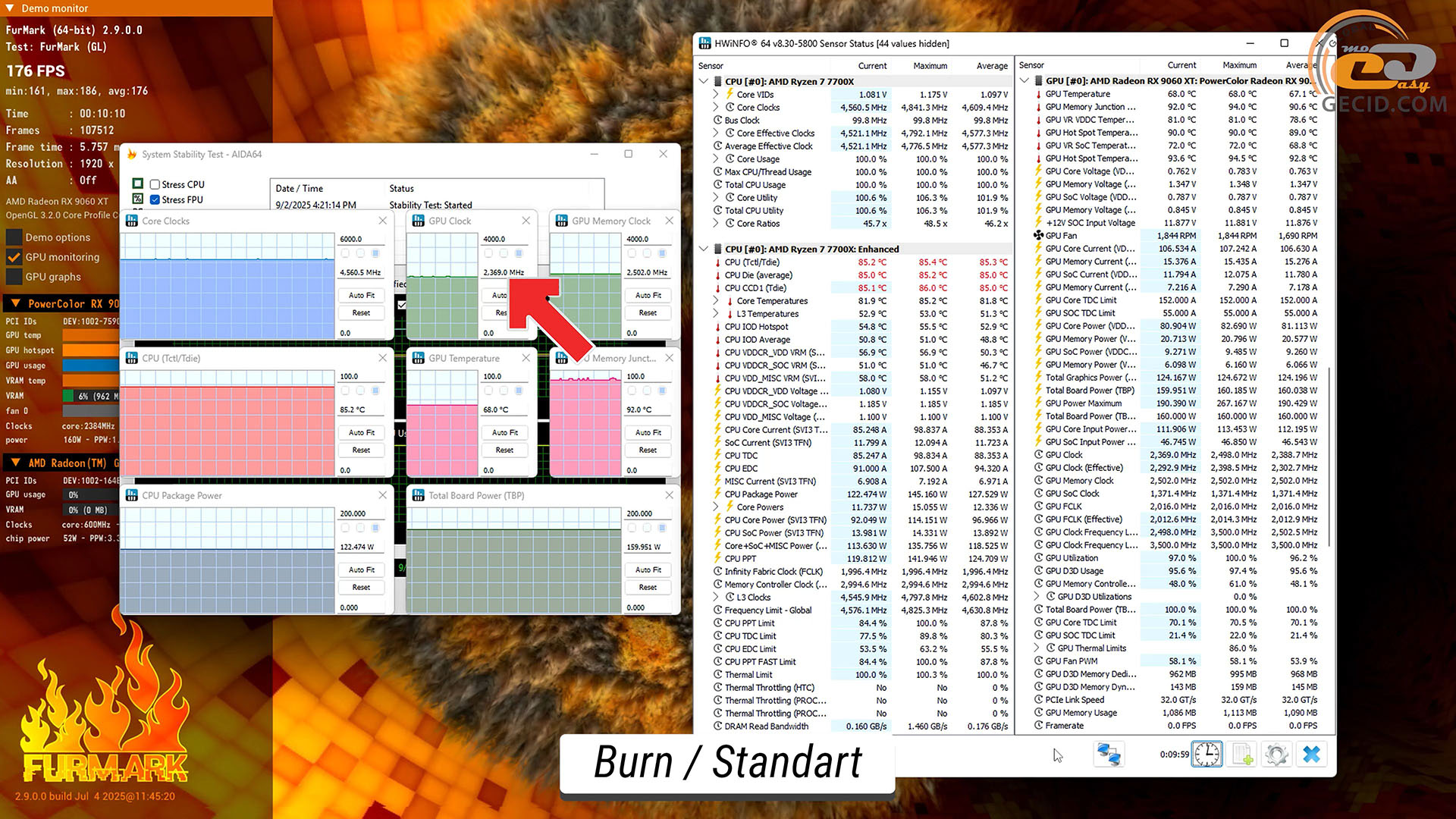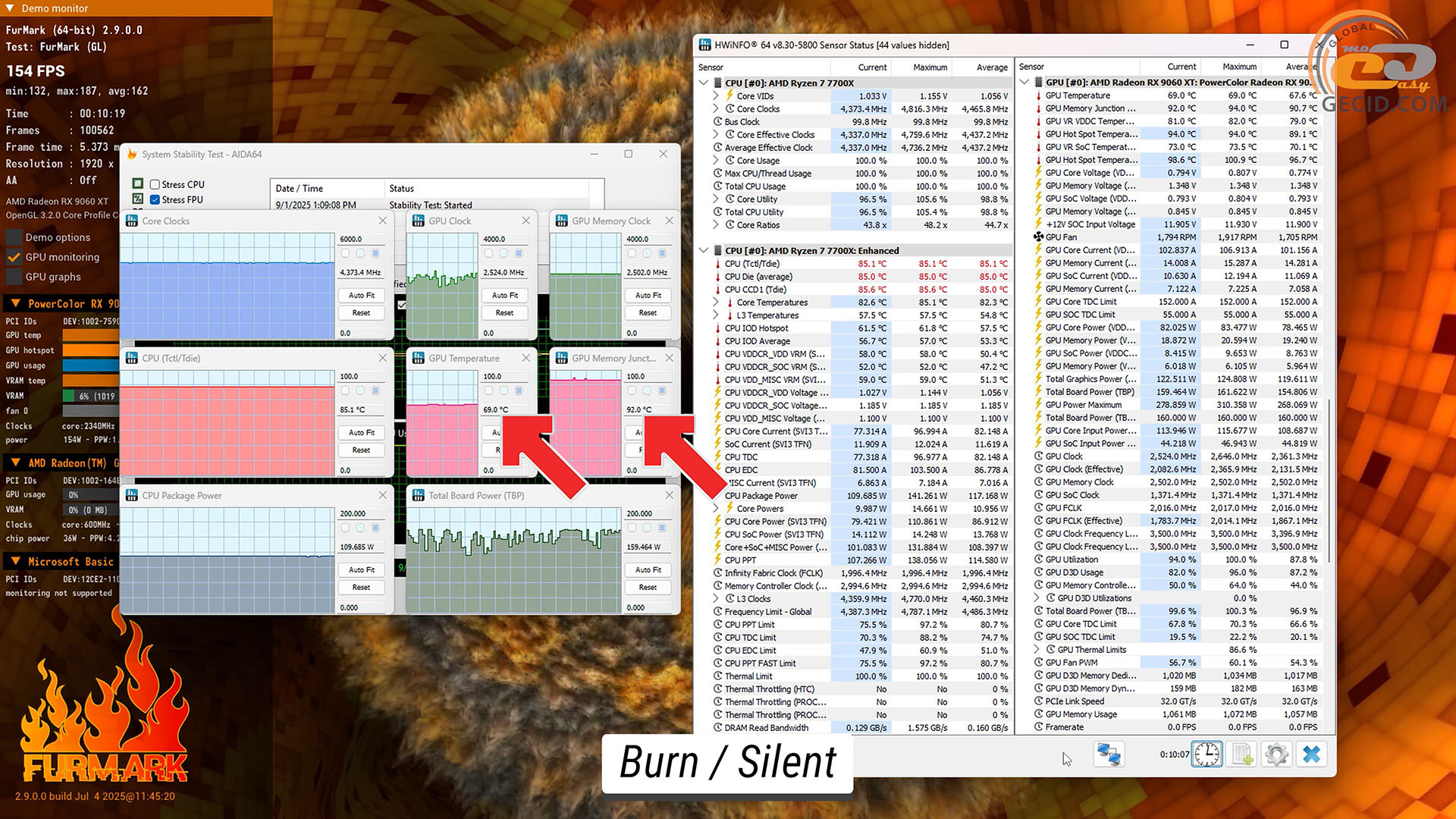 Если же максимально нагрузить компьютер, например, в FurMark, но оставить тихий режим работы системы, то процессор греется до примерно 85 градусов, что является ограничением в BIOS, а видеокарта работает с примерно теми же частотами, что и ранее, при более низкой температуре: графический процессор - 68°C, а VRAM - 92°C.