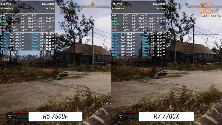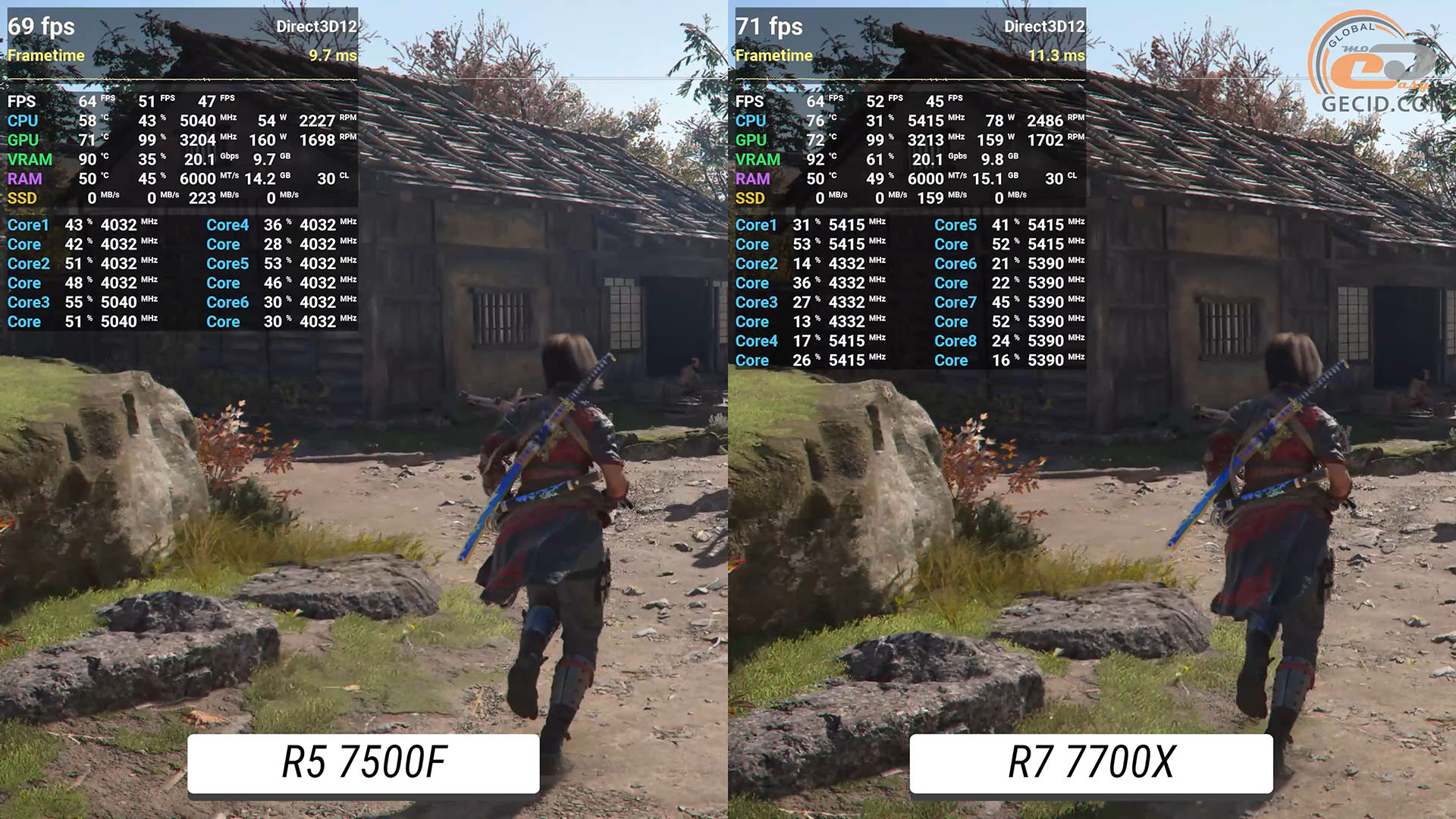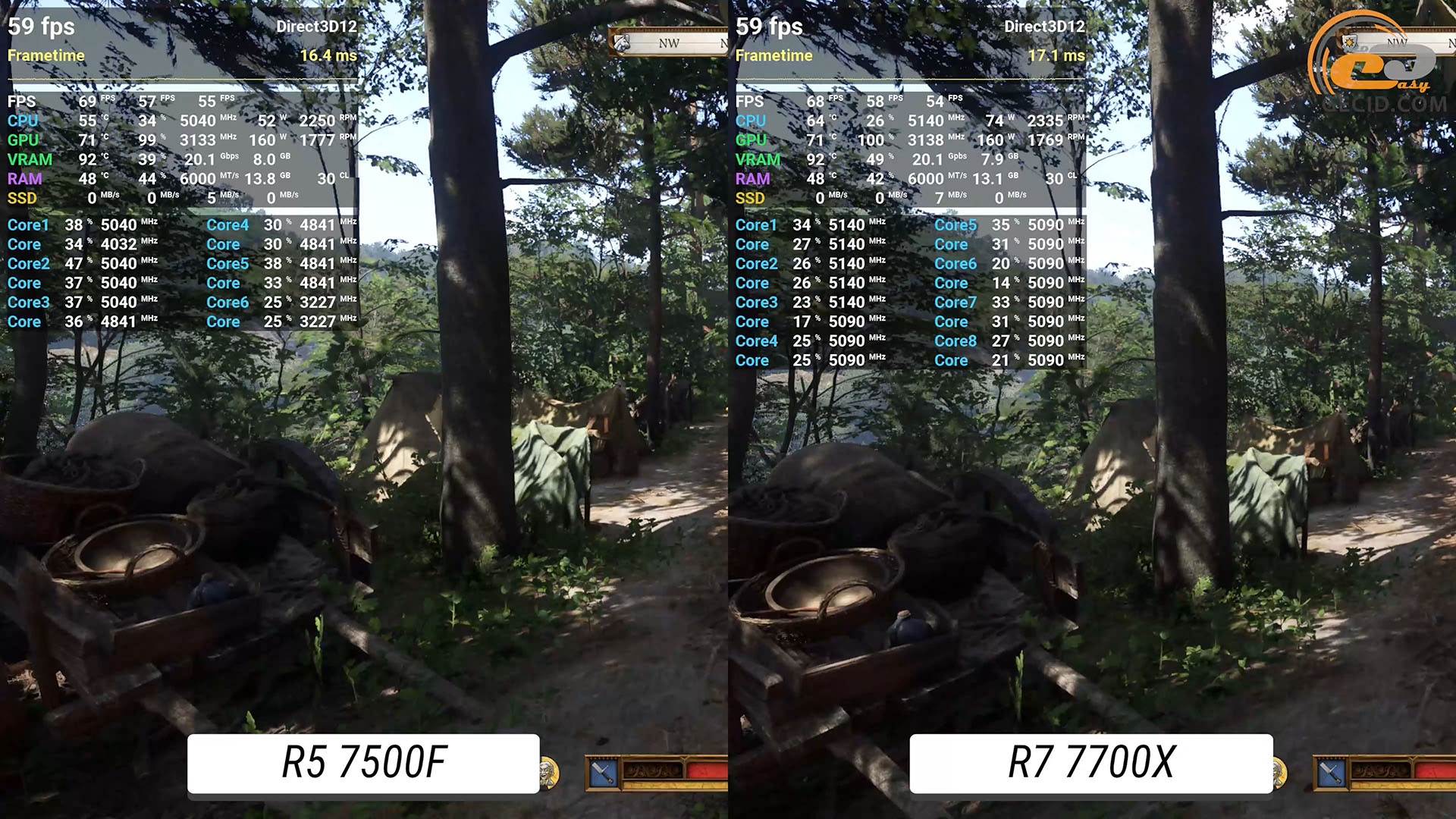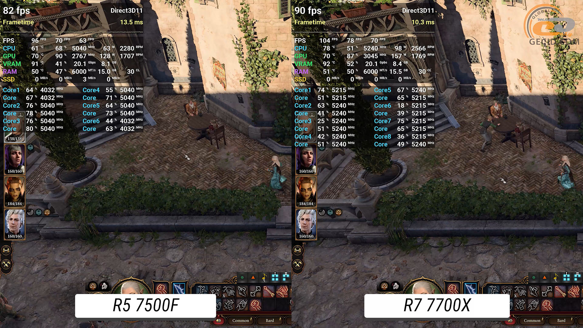 В Baldur`s Gate 3 с тем же ультра пресетом 8-ядерник заметно лучше нагружает видеокарту в сложных ситуациях с кучей NPC, что и в целом добавляет почти 10% быстродействия и уменьшает просадки. Хотя на 7500F геймплей достаточно комфортный, особенно в DirectX 11.