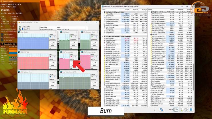 Во время испытания тяжелым бенчмарком процессор разогрелся до примерно 80 градусов Цельсия, а видеокарта почти до 70-ти, при этом работая на приблизительной частоте в 2365 МГц. VRAM же статически находилась на планке в 94 градуса.