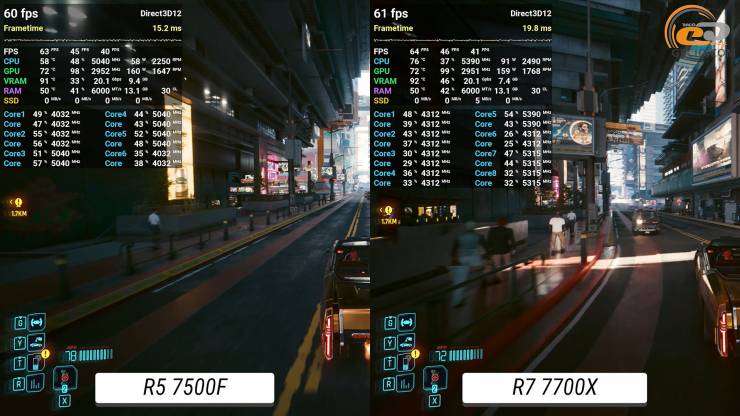 А вот Cyberpunk 2077 на Ультрах вполне хватает и 6-ядерного процессора, когда ограничивающим фактором выступает видеокарта. Да, с 7700X косметически улучшились показатели 1 и 0.1% Low, однако те 1-2 FPS никак не влияли на впечатление от игрового процесса.